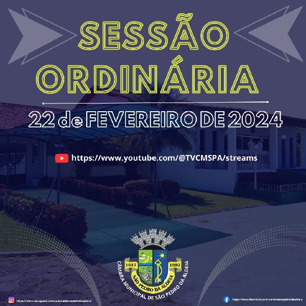 A próxima Sessão Ordinária da Câmara Municipal de São Pedro da Aldeia acontecerá nesta terça-feira, 27 de fevereiro, às 11:00h.