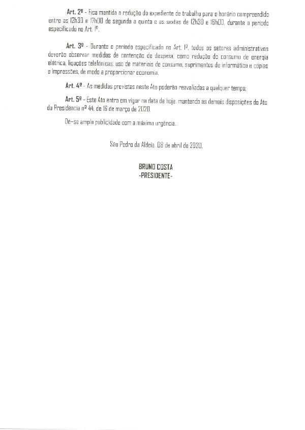 Em consonância com o que determina a Organização Mundial de Saúde (OMS), Ministério da Saúde e demais órgãos especializados e com o surgimento de novos casos de coronavírus (COVID-19) em São Pedro da Aldeia, a Câmara Municipal estendeu até o dia 22 de abril, a suspensão das atividades legislativas presenciais e acesso do público às dependências da Casa Legislativa, conforme Ato nº 48/2020.